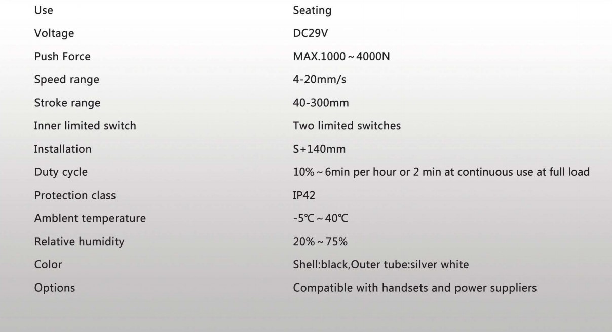 本產品已通過CE、UL、PSE、ISO9001認證,它有一個新穎的外觀和制作精良,噪音小,操作簡單,讓它成為暢銷國內外,被廣泛用于電動沙發、醫療床、手術床,按摩椅等。